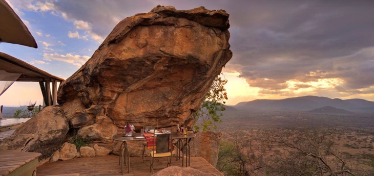 Saruni Samburu sits high on a rocky ridge overlooking the Kalama Conservancy, with sweeping views across arid plains, acacia woodland, and distant hills. The elevated position immediately sets it apart, creating a sense of distance from the safari circuit below and a strong connection to the landscape. The lodge’s villas are carved into the rock and spaced for privacy, making the setting feel intentional and calm rather than busy or centralized.
